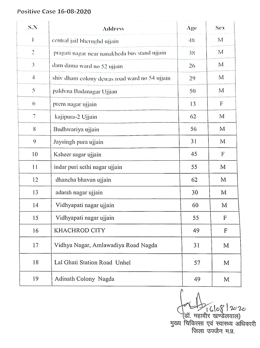 उज्जैन कोरोना हेल्थ बुलेटिन 16 अगस्त 2020