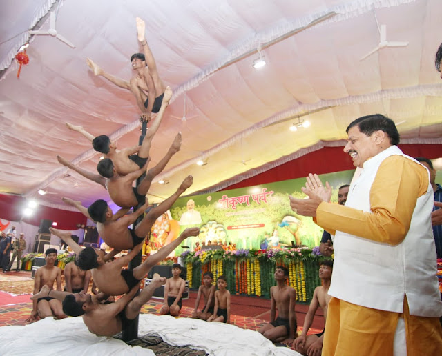 उज्जैन। उज्जैन के मल्लखंब खिलाड़ियों ने भोपाल में मुख्यमंत्री निवास पर शानदार प्रदर्शन किया, जिससे दर्शक अचंभित हो गए। श्री अच्युतानंद गुरु अखाड़ा और कालिदास कॉलेज मल्लखंब सेंटर के राष्ट्रीय ख्याति प्राप्त 18 खिलाड़ियों के दल ने जन्माष्टमी के अवसर पर आयोजित दो दिवसीय सांस्कृतिक कार्यक्रम के तहत मुख्यमंत्री निवास पर मल्लखंब का हैरतअंगेज प्रदर्शन किया। प्रदर्शन के दौरान मुख्यमंत्री डॉ. मोहन यादव ने मंच से उतरकर खिलाड़ियों की हौसला अफजाई की और उनकी प्रशंसा की। इस प्रदर्शन से प्रभावित होकर मुख्यमंत्री ने प्रत्येक खिलाड़ी को 10,000 रुपए के मान से कुल 1,80,000 रुपए देने की घोषणा की।